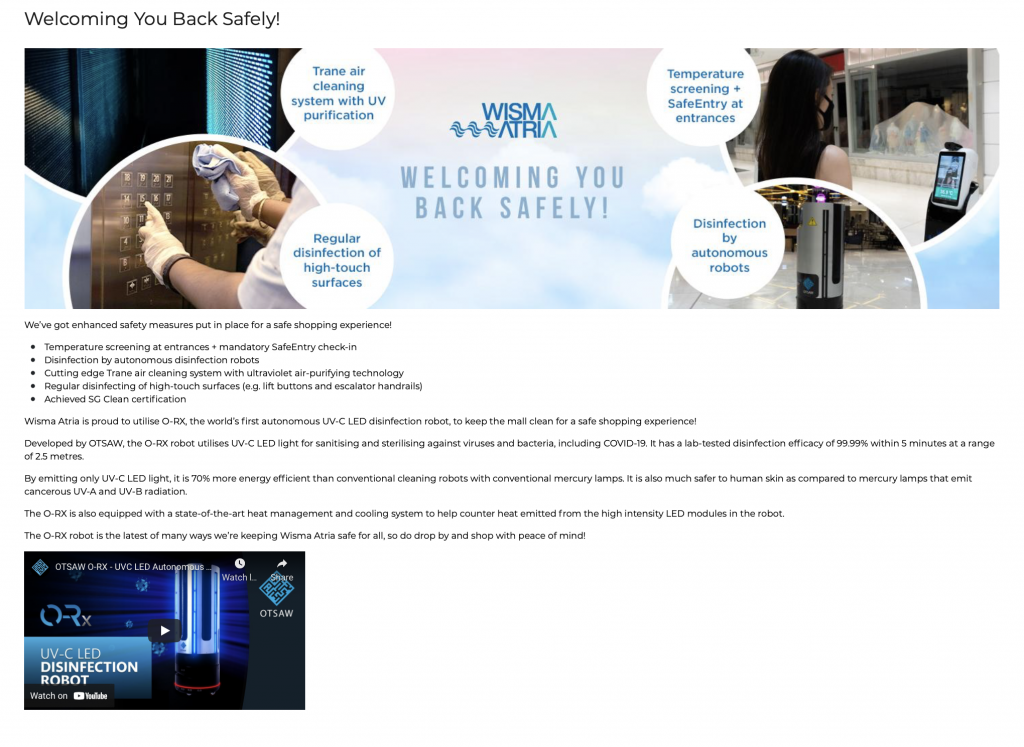 Activ OTSAW 與購物中心 Wisma Atria 合作,Wisma Atria 使用 OR-X UV-C LED 消毒機器人 ,保持購物中心干凈。Singapore 正準備與新冠病毒共存。因此,新加坡將打開國門。由于用工短缺,您將會看到更多諸如 Activ OTSAW 的機器人在工作。